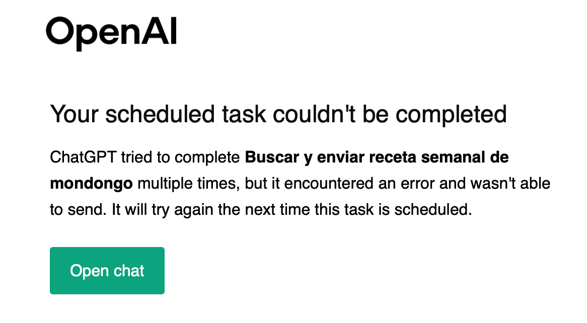 Update: justo cuando estaba por publicar me llega este correo. Pensaba que andaba todo bien y OpenAI me avisa que mi tarea programada no pudo ser completada.