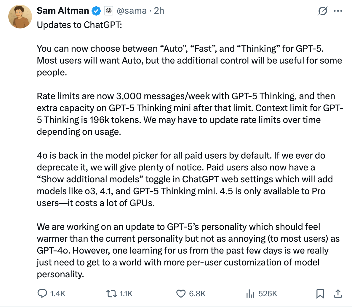 Pasó de todo, Sam se disculpó, prometió traer de vuelta a GPT-4o, aumentar los límites de uso, etc etc. Todos estos cambios se han estado dando mientras escribo este post así que disculpa si se nota un poco el caos aquí también :P