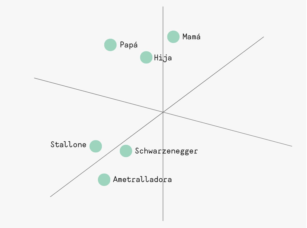 En este espacio las palabras con significado parecido están más cerca. Por ejemplo “Mamá” y “Papá” van a esta cerca de “hija”, pero lejos de “ametralladora”. Por otro lado, las palabras “Stallone” y “Schwarzenegger” también deben estar cerca (y seguramente sí estén cerca a “ametralladora”).