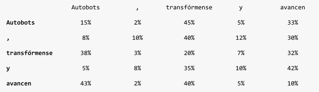 Fíjate cómo algunas palabras tienen mayor relación con otras. Por ejemplo la palabra “Autobots” está muy relacionada a “transfórmense”, pero no tanto con “y” o con la coma (“,”). Si te das cuenta, todos los números asociados a una palabra (es decir una fila de la tabla) suman 100%. Eso nos permite comparar la atención que cada palabra le da a las demás.