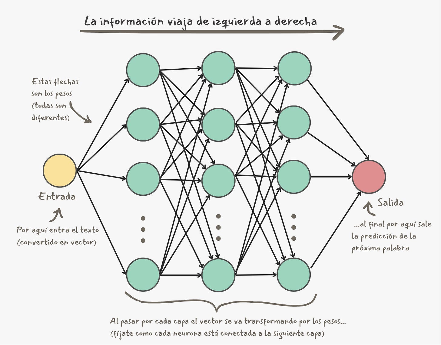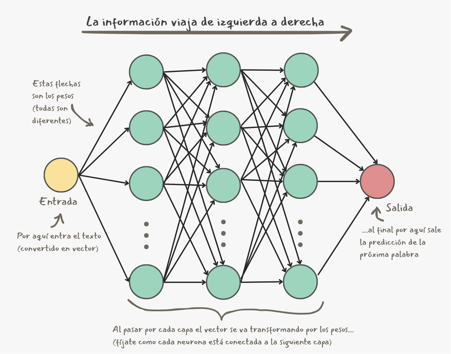 La información (el texto convertido en números, digámosle vector) viaja por esa red desde la primera capa hasta la última y dependiendo de la información que entra a una capa y de los parámetros de esa capa el vector cambia. Y así capa por capa, la información va ajustándose hasta llegar a la última capa que nos da la próxima palabra en el texto.