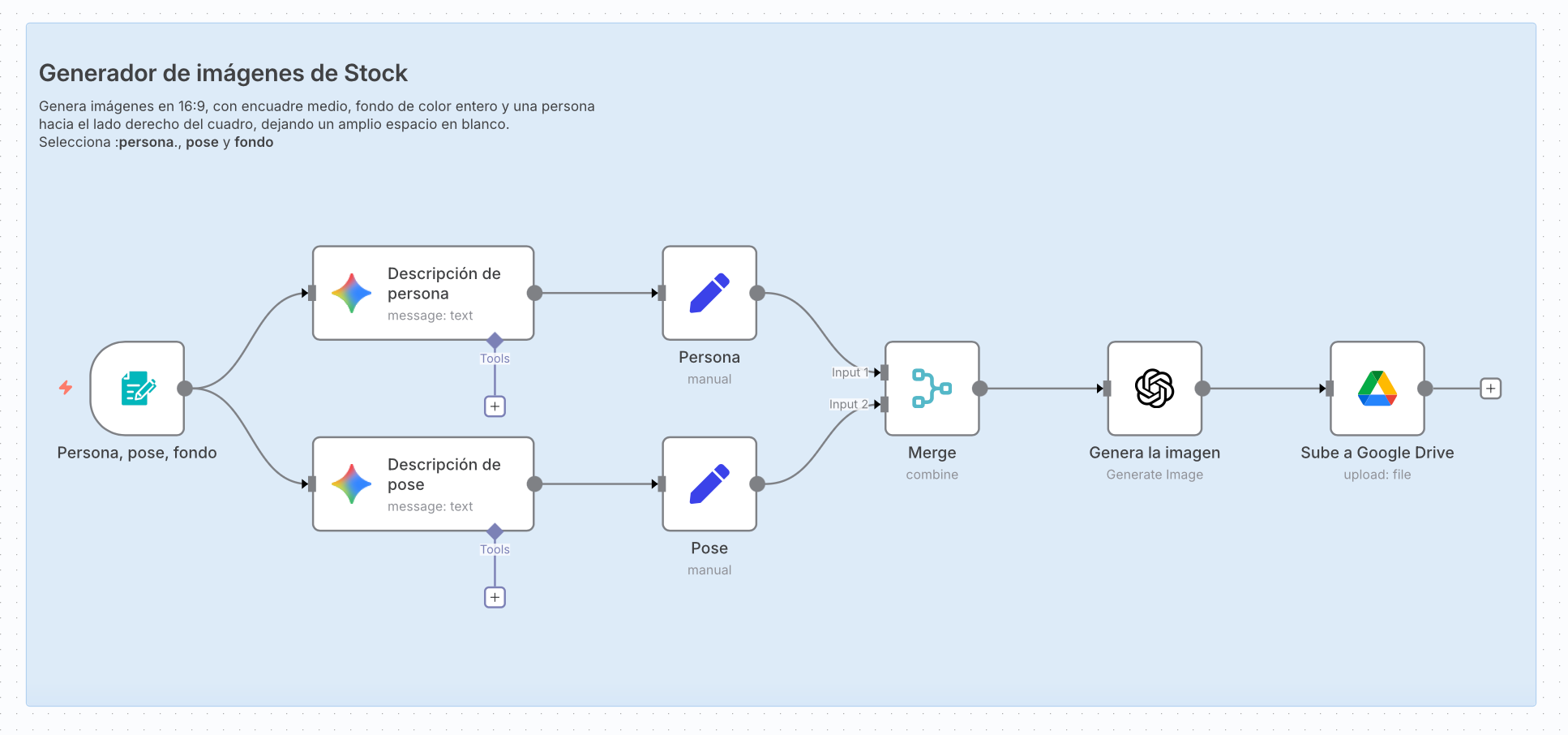 Por ejemplo, armé un flujo donde un formulario pide tres cosas: un personaje, una pose y un color de fondo. Con eso, un modelo de lenguaje (Gemini) genera una descripción más detallada y luego ChatGPT produce una imagen estilo stock que termina guardada en Google Drive. Todo en automático, paso a paso, sin escribir código.