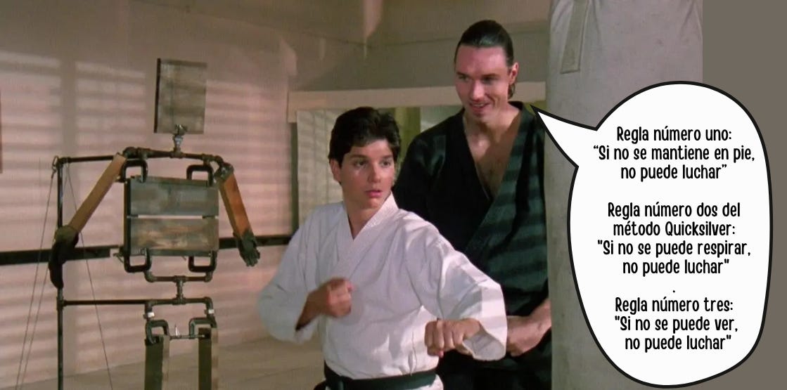 Volvamos por un minuto a Karate Kid III. Aquí aparece Terry Silver (uno de los mejores villanos de la serie) y su método Quicksilver, un sistema de entrenamiento intensivo con sólo tres reglas.