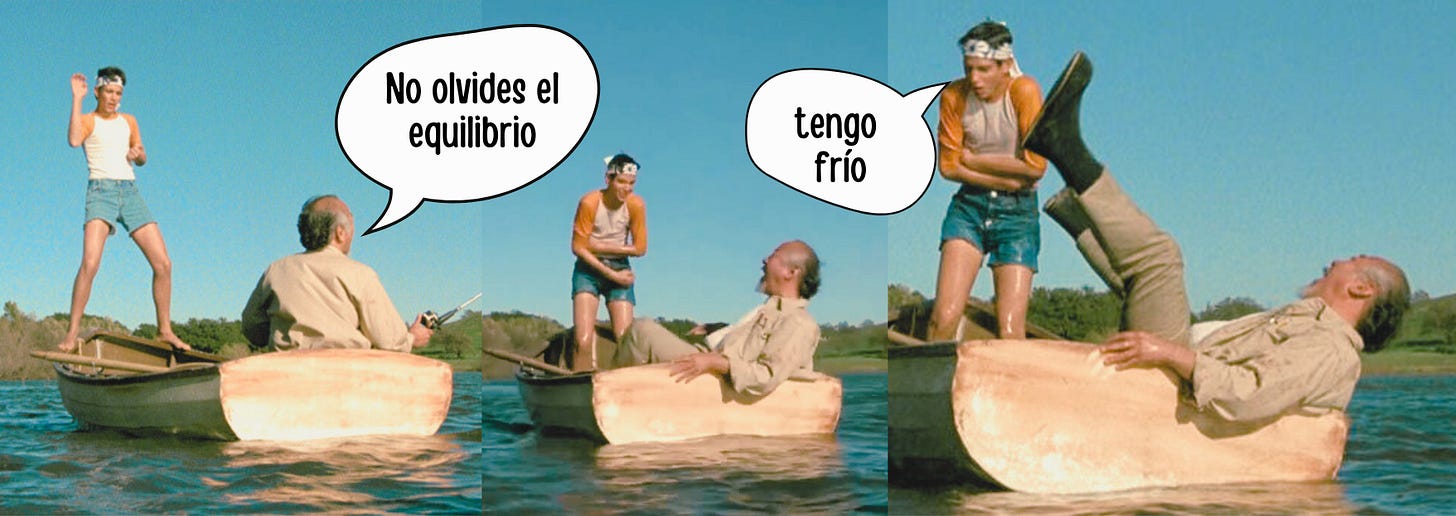Si has visto la serie Cobra Kai, entenderás un poco más sobre equilibrio. Aquí nuestro querido Johnny Lawrence, [spoiler] consigue equilibrar la agresividad de su dojo con la filosofía de Miyagi. Todo sin dejar de usar su gi negro sin mangas (badass!).[/spoiler].