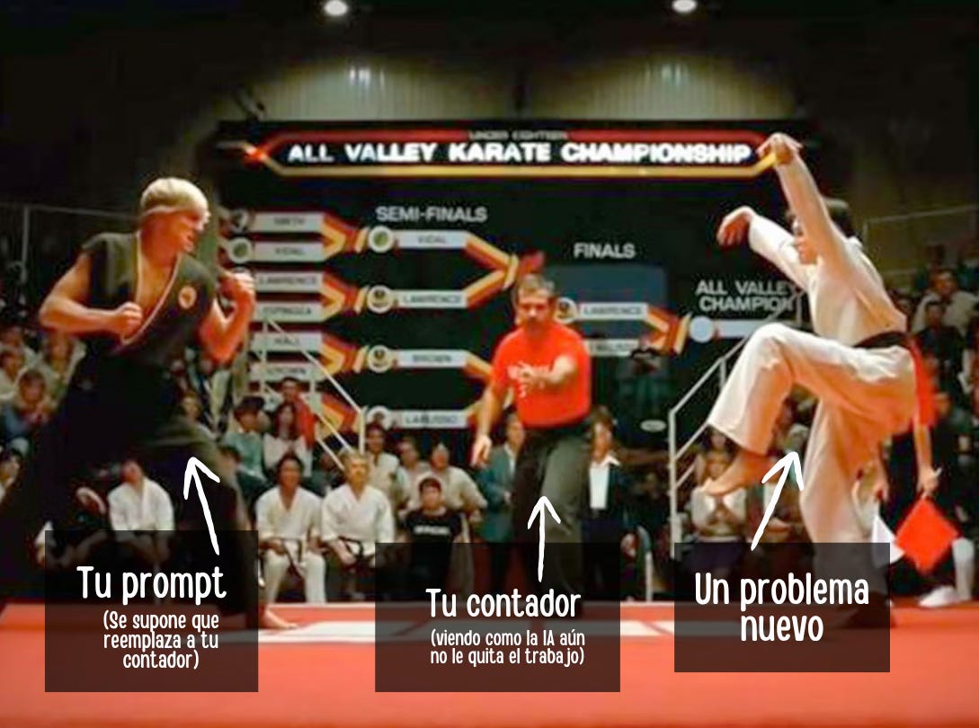 Hay mucho, mucho, mucho contenido sobre “los mejores prompts para X”, y no hay tanto que trate de explicar cómo funciona la IA. Aún menos en español, y casi ninguno lo hace con memes de Karate Kid y referencias a comida peruana ;)