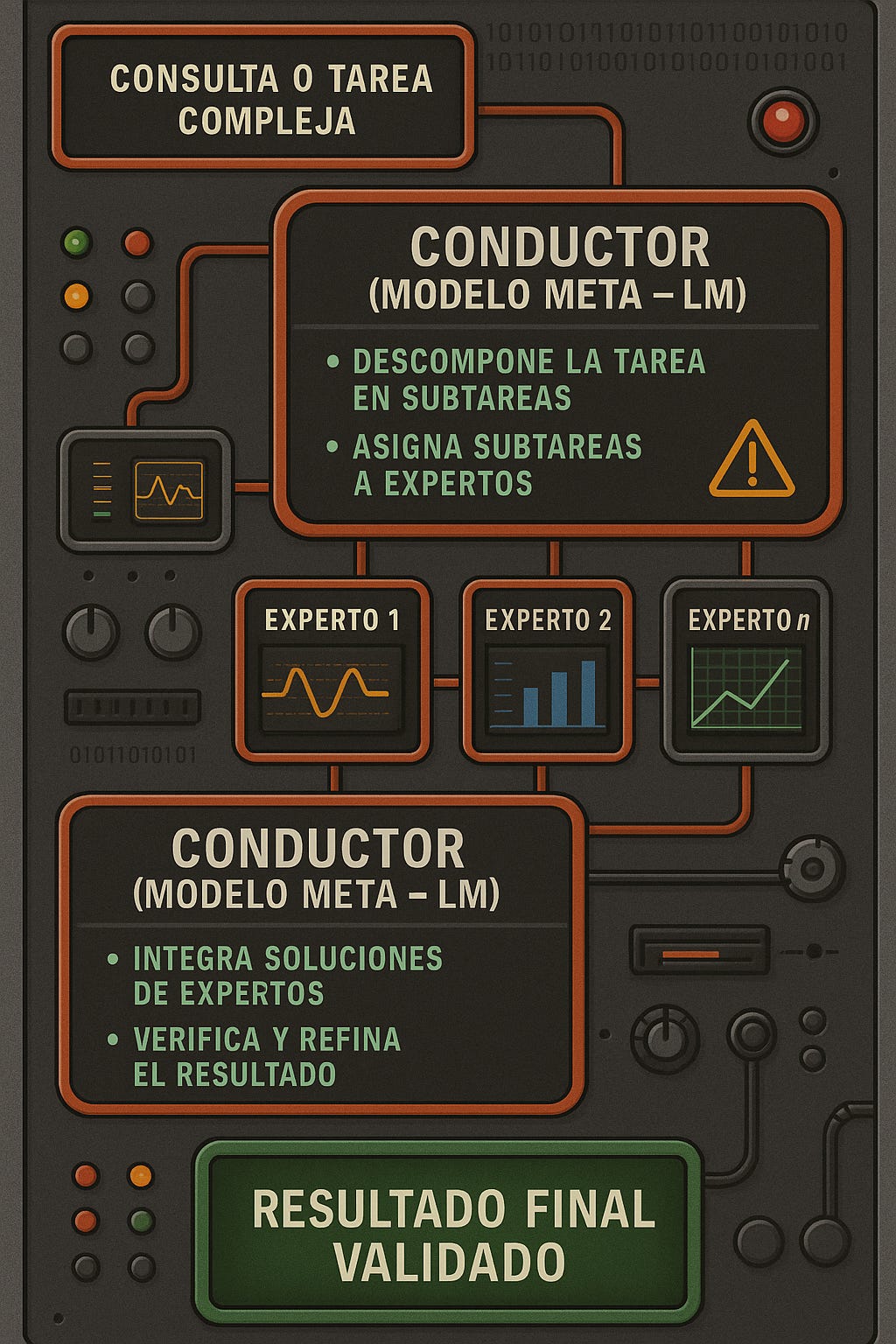 Todos estos chats son conducidos por una IA que trabaja como “director de orquesta”, analizando un problema, descomponiendo el problema en sub tareas y consultando a otras IAs “expertas” para buscar la mejor forma de realizar esas sub tareas. Luego este director de orquesta toma todas las respuestas de los “expertos”, las junta y da una respuesta final.