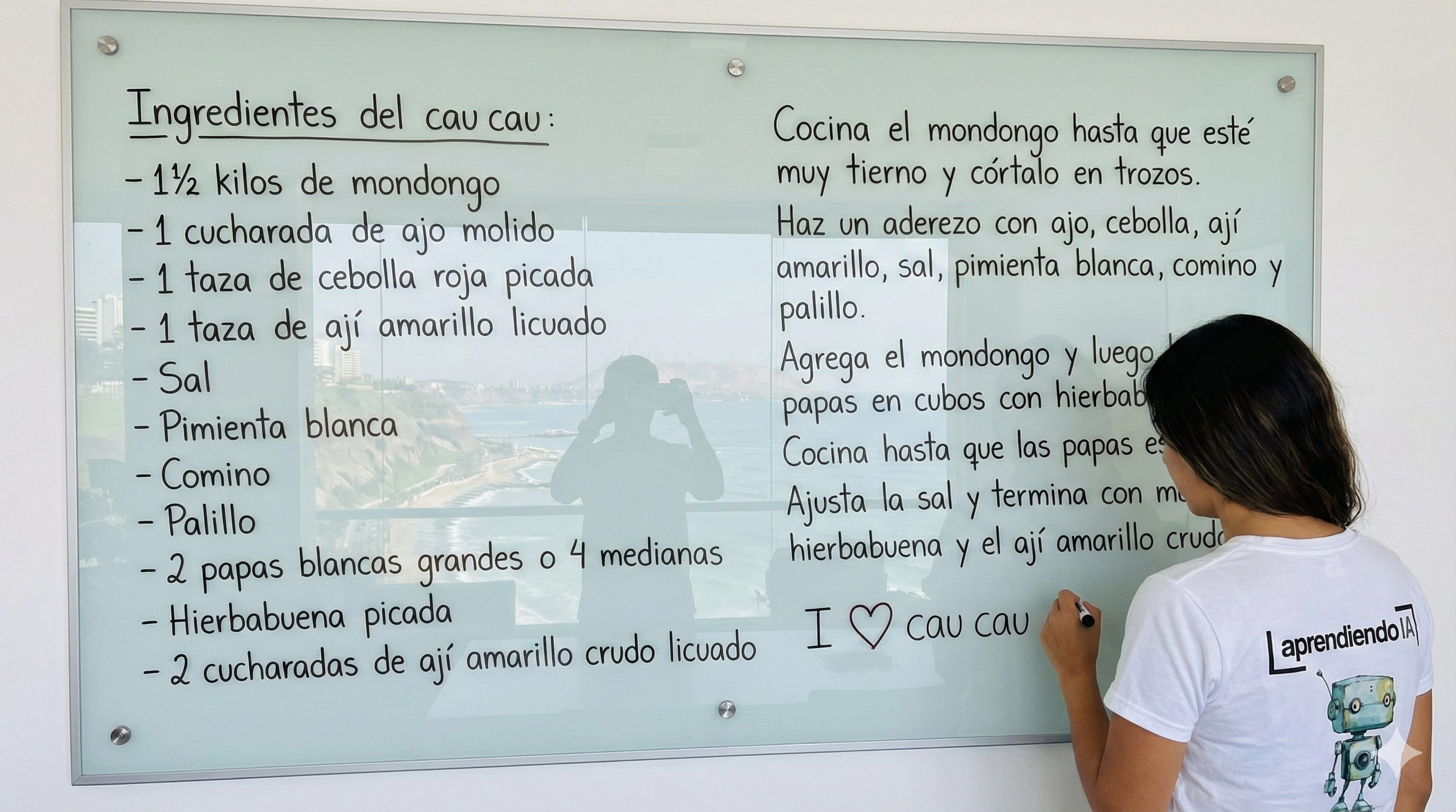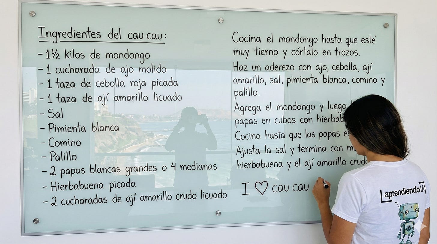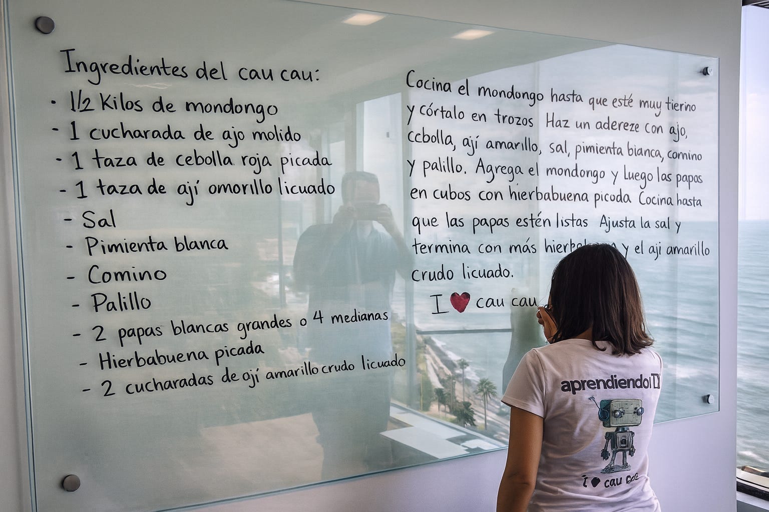 Foto tomada con un teléfono en horizontal de una pizarra de vidrio en una sala con vista al Malecón de Miraflores. En el encuadre se ve a una mujer escribiendo en la pizarra, usando una camiseta blanca con el logo y robot de Aprendiendo IA impreso (imagen adjunta).
