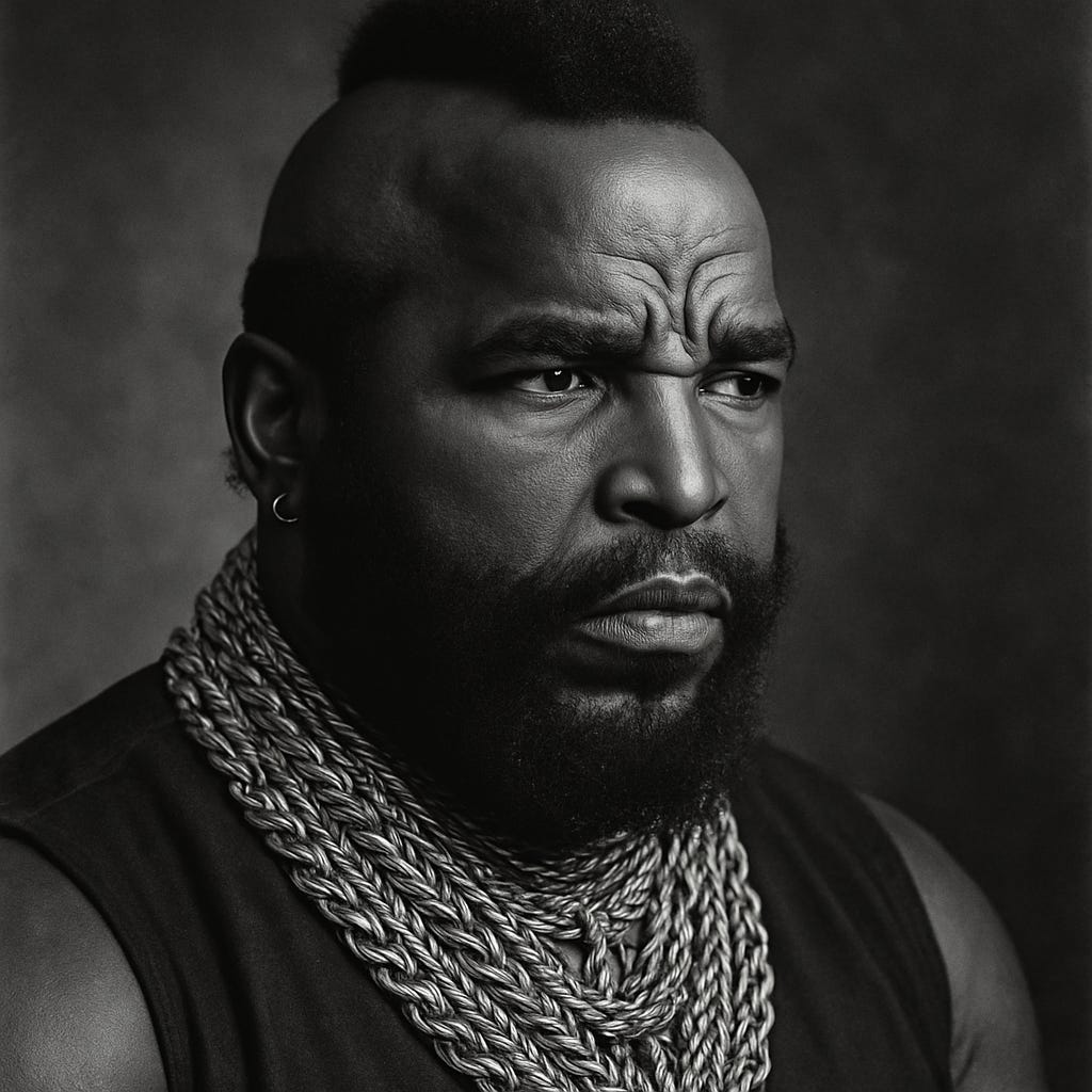 Empecemos por Mr. T, o como lo conocemos por aquí los que vimos Las Magníficos, Mario Baracus. (En otros países la serie se llamaba La Brigada A).
