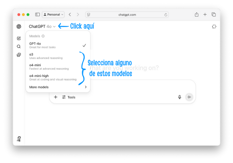 Paso 1: Escoge un modelo de razonamiento como o3, o4-mini, o-4-mini-high (OpenAI no es la mejor poniendo nombres, no crees?)