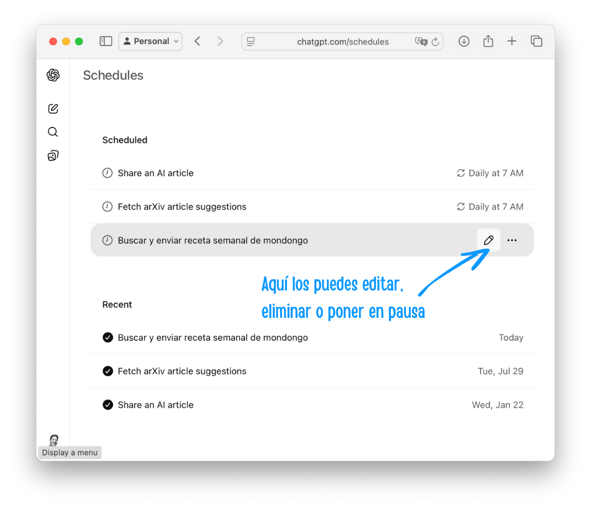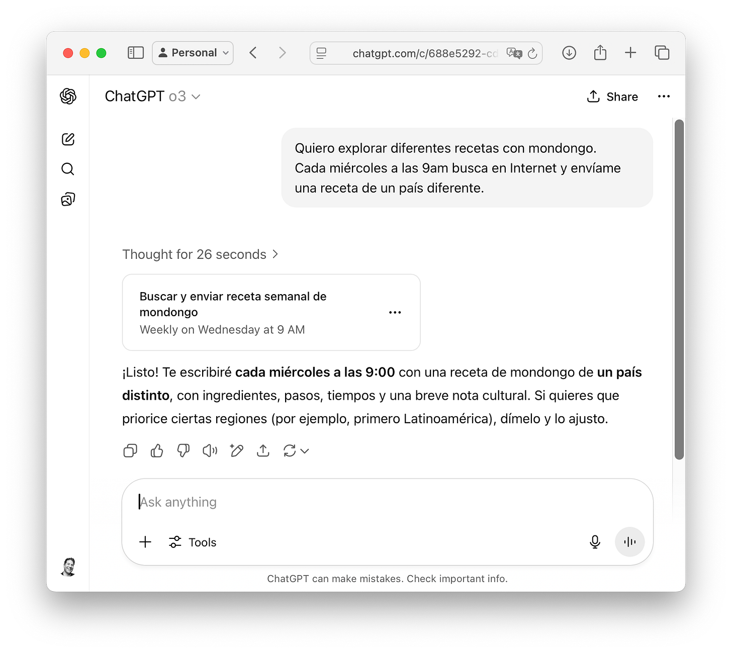 Las tareas programadas de alguna manera están invirtiendo esa dinámica. Ahora, hay momentos en los que no somos nosotros los que buscamos a la IA sino que ChatGPT nos busca a nosotros. Se convierte en el que dice, “Hey, es miércoles y encontré esta receta de mondongo para ti!”.