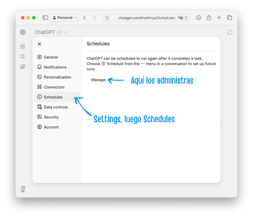 Lo primero que tienes que saber es que no hay un botón para agregar una tarea programada, se programan durante una conversación. Pero no cualquier conversación, se hace mientras hablas con un modelo de razonamiento como o3 y o4-mini.